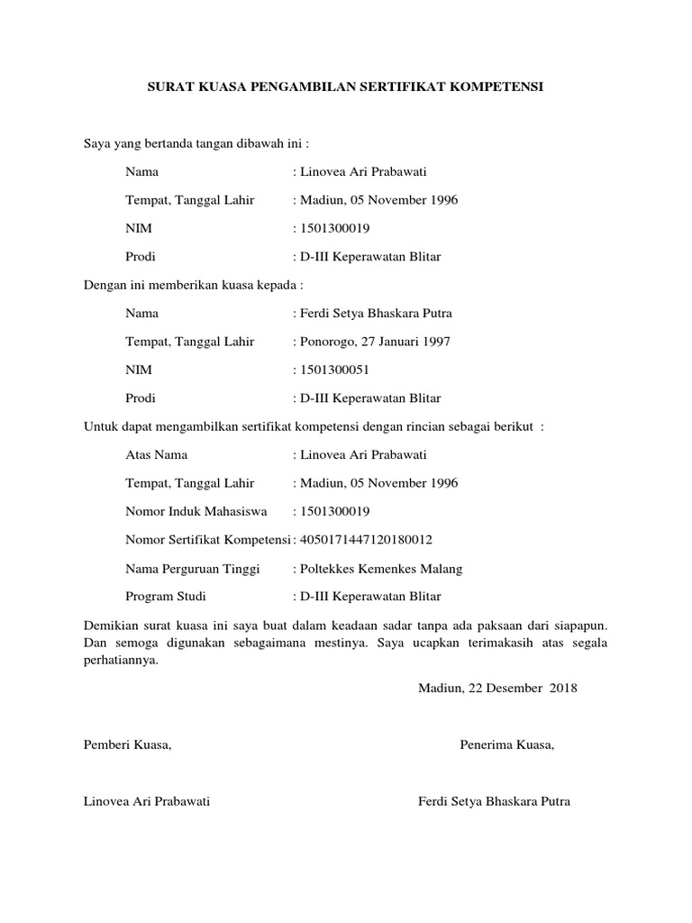 Contoh surat kuasa khusus pengambilan bpkb, gaji, uang, ijazah, paspor, dokumen, barang. Berikut ini adalah salah satu surat kuasa sederhana yang mungkin sering ditemukan bila kalian atau teman kalian pernah meminta kalian untuk mengurus krs mereka. Contoh surat kuasas pengambilan ijazah pendidikan surat kuasa perseorangan yaitu surat kuasa yang diberikan oleh seseorang kepada orang lain. Atau surat kuasa penjualan tanah? Begini, secara umum surat kuasa adalah sebuah surat yang berisi pernyataan bahwa kita memberikan kuasa atau wewenang kepada seseorang secara resmi untuk.