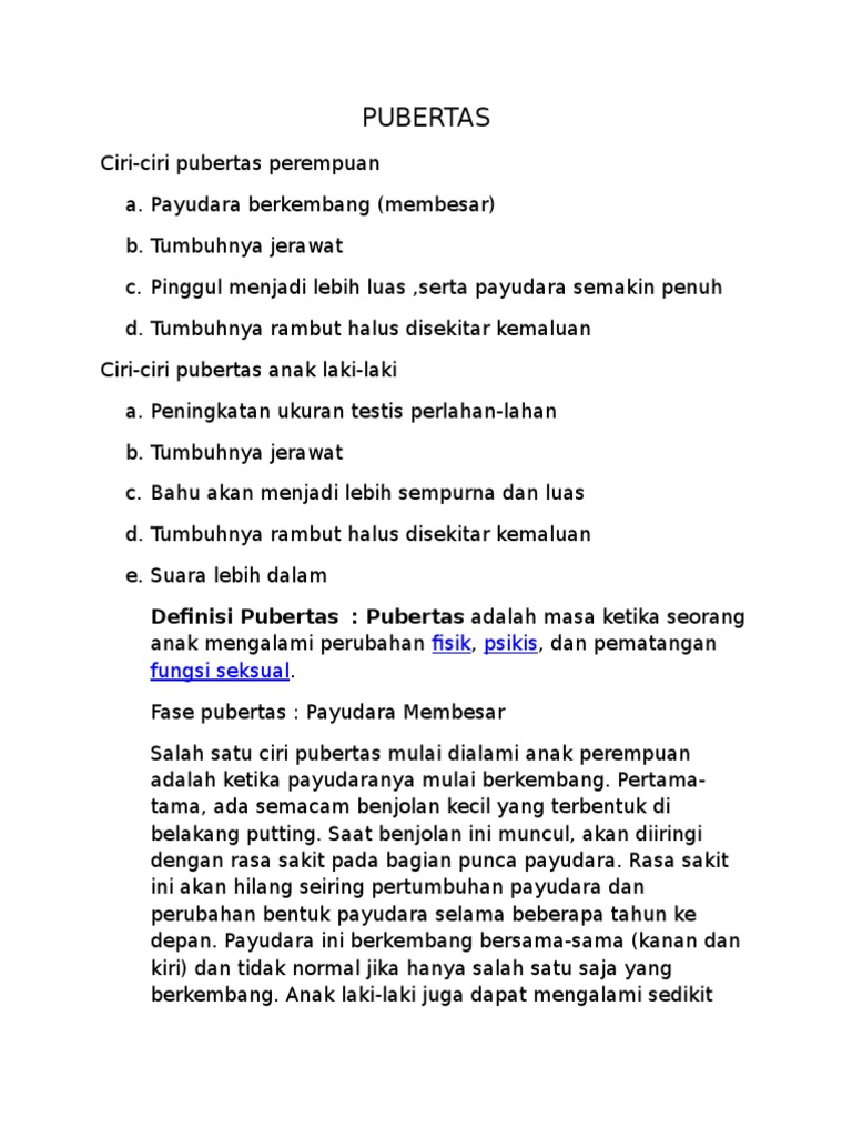 Bertambahnya ukuran tulang menjadikan tubuh bertambah tinggi dan besar 6. Pada masa pubertas anak mengalami berbagai perubahan, terutama perubahan fisiknya. Quran in word merupakan sebuah aplikasi kecil. Suara menjadi terdengar lebih berat dan besar 5. Seorang anak perempuan akan mengalami perkembangan tunas payudara, yang mulai terbentuk di bawah puting.